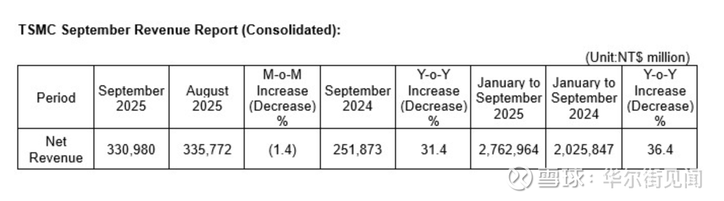 台积电第三季度营收同比增长30%,达到9899亿新台币,超出分析师平均预期的9628亿新台币;前三个季度累计销售额2.76万亿元台币,同比增长36.4%。