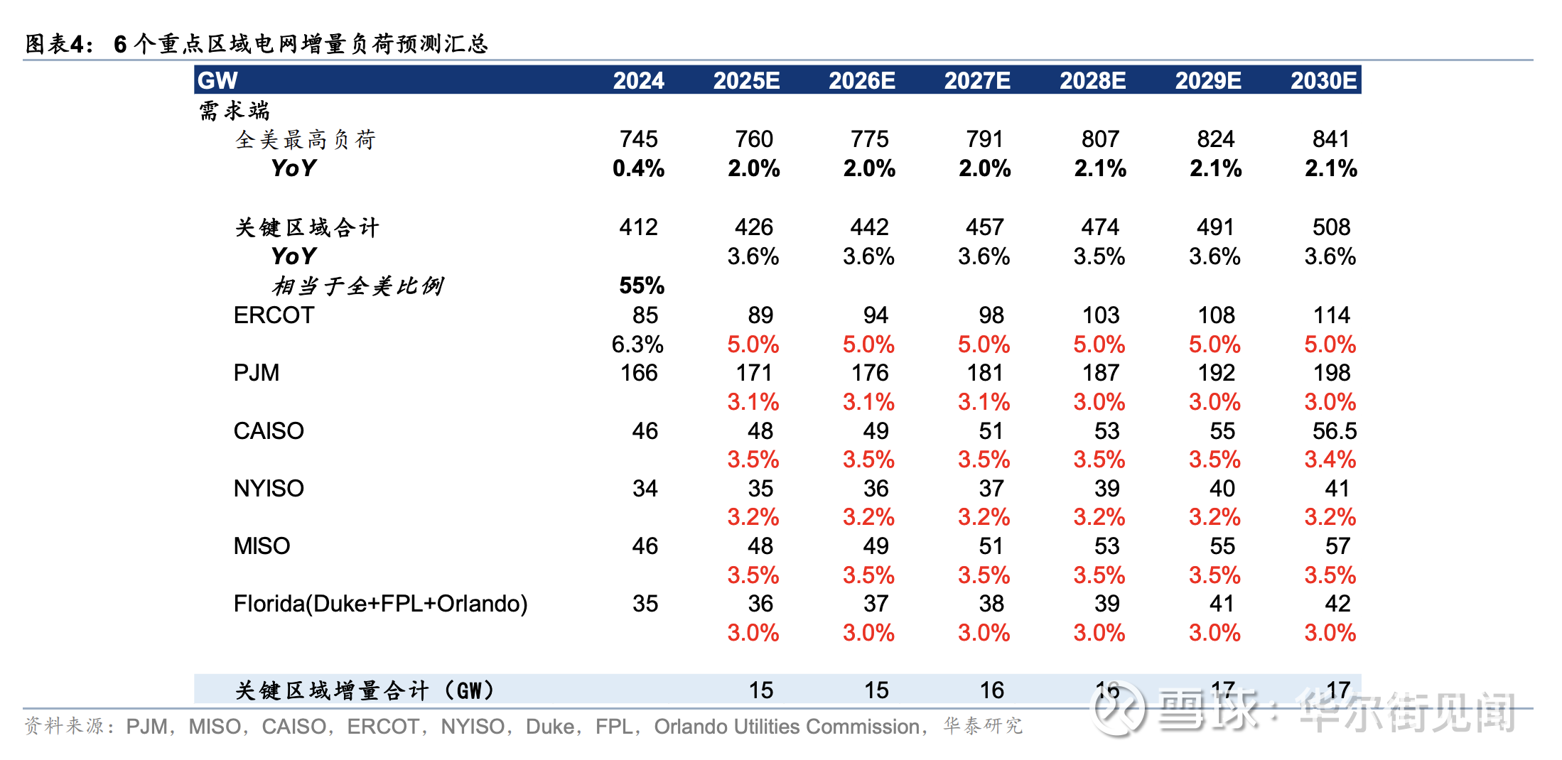 华泰证券表示,6个重点区域(占美国最高负荷55%,涵盖主要数据中心聚集州)的增量负荷预测年均在15GW以上,意味着非数据中心年均也将有2GW以上的增量负荷。综合测算,美国最高负荷有望保持2%以上增速,相比2016-2024年0.5%的复合增长率翻了两番。