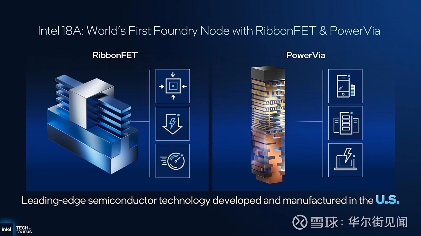 18A制程融合了RibbonFET全环绕栅极晶体管技术和PowerVia背面供电系统两大创新。RibbonFET是英特尔十多年来首个全新晶体管架构,实现更好的缩放和更高效的开关性能。PowerVia则是突破性的背面供电系统,增强功率流和信号传输。