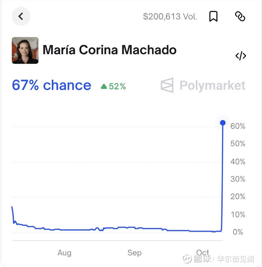据媒体周六报道,在委内瑞拉反对派领袖María Corina Machado获得2024年诺贝尔和平奖之前12小时,一名代号"6741"的新注册用户在加密货币预测市场Polymarket上大笔买入,将María Corina Machado的获奖概率从5%大幅推高至70%,最终斩获超过5万美元利润。
