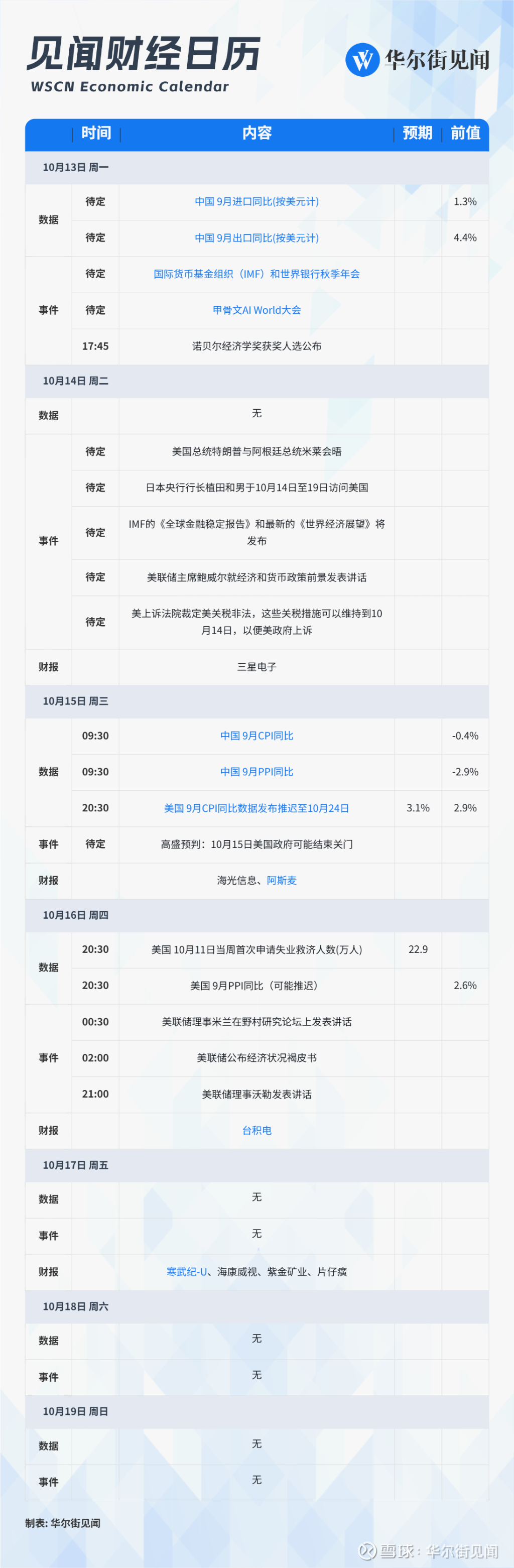 10月13日 - 10月19日当周重磅财经事件一览,以下均为北京时间: