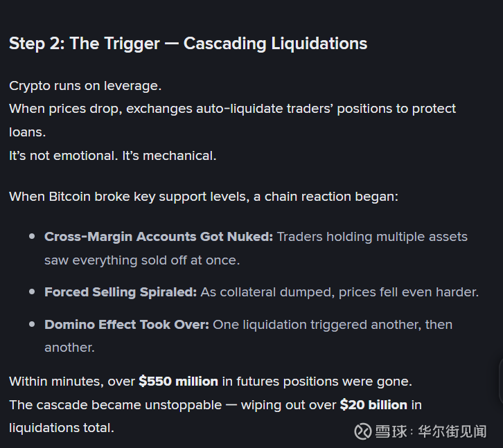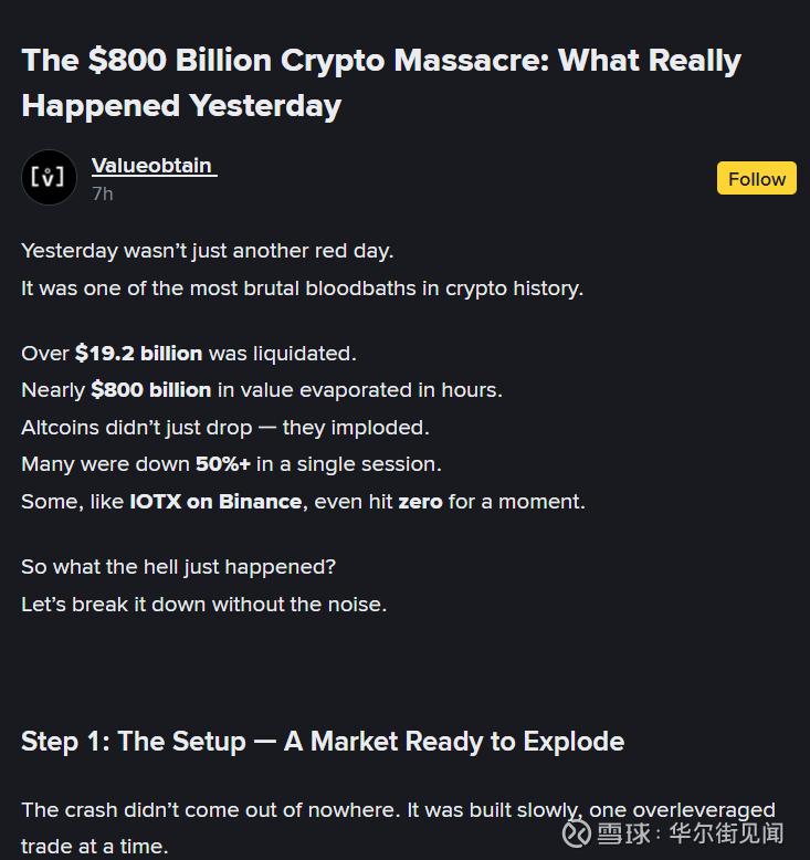 一场“铁索连舟”式的清算根据币安广场上一篇广为流传的帖子分析,这次崩盘并非毫无征兆,而是在一个高度杠杆化的市场环境中缓慢酝酿的。