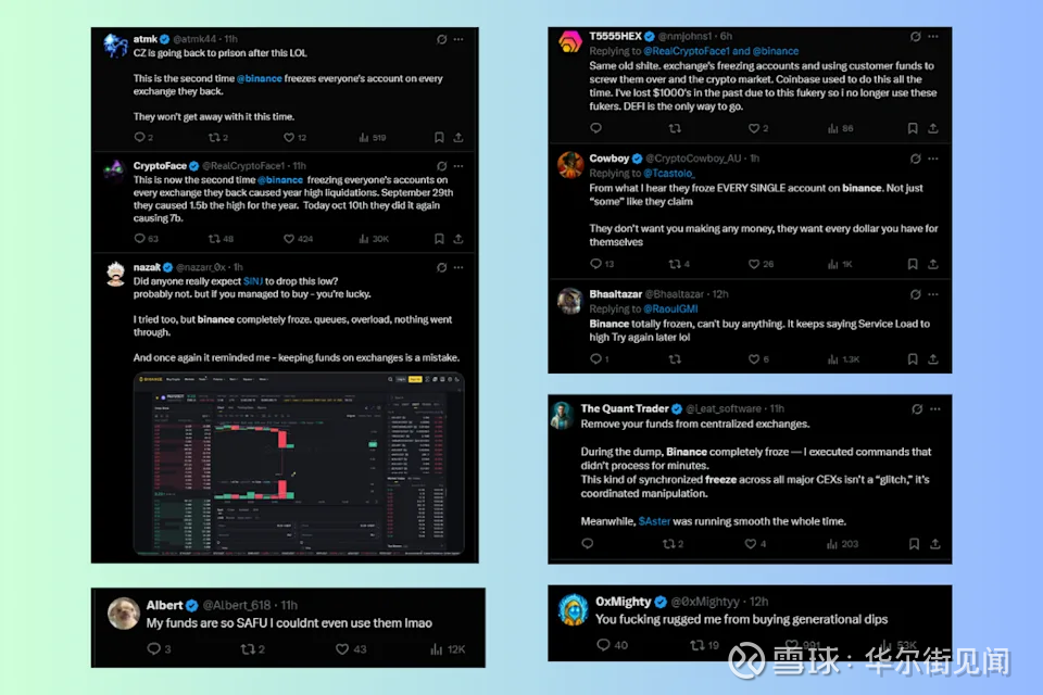 而当市场最需要流动性时,部分中心化交易所(CEX)却掉了链子。在清算高峰期,币安等交易所出现系统延迟和交易中断,大量用户报告无法执行订单或管理仓位,导致损失扩大。