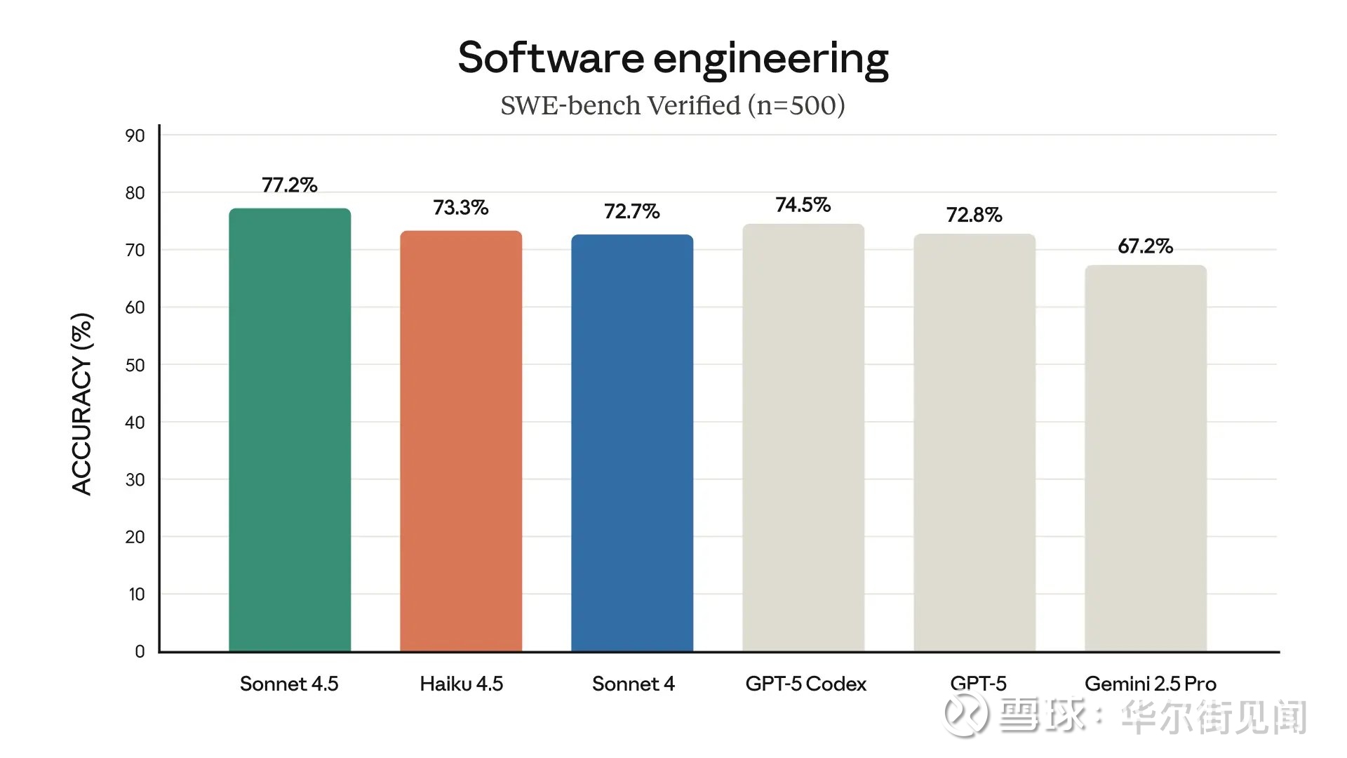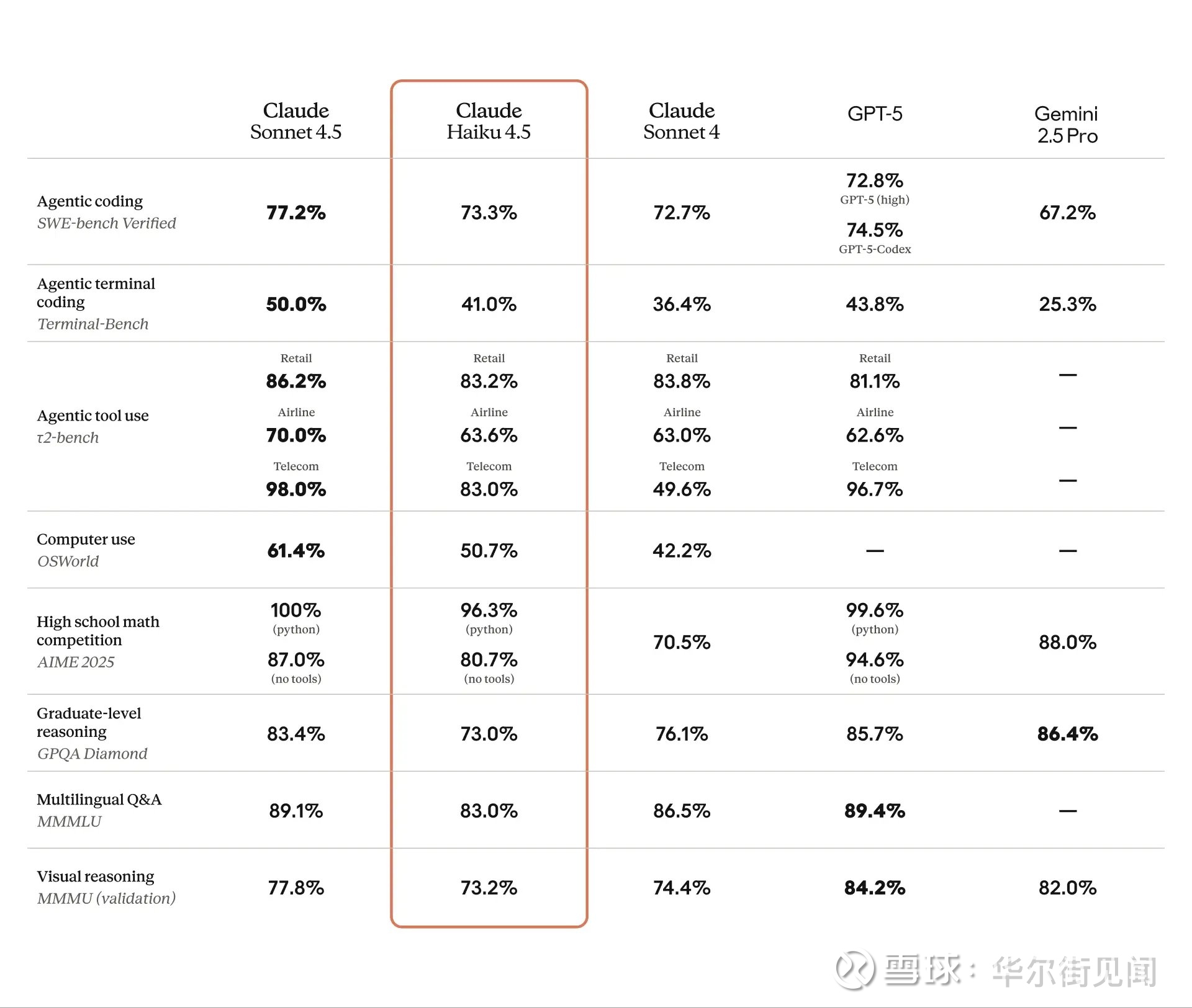 据Anthropic披露的测试结果,Haiku 4.5在SWE-Bench验证测试中得分73%,在Terminal-Bench测试中得分41%,虽低于上月末Anthropic推出的“全球最强编程模型”Sonnet 4.5,但与其前代Sonnet 4、OpenAI的GPT-5和谷歌的Gemini 2.5的表现相当。在工具使用、计算机操作和视觉推理等基准测试中,Haiku 4.5也显示出类似水平。