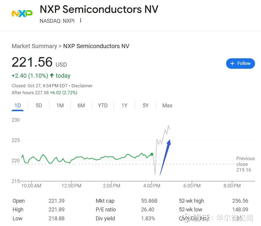 财报公布后,周一本已收涨1.1%的纳斯达克上市恩智浦美股盘后进一步走高,盘后涨幅曾接近3%。