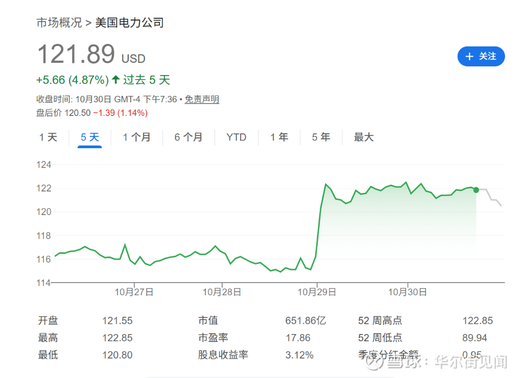 当地时间10月29日,这家美国大型公用事业公司宣布,其未来五年的资本支出计划将激增33%,达到720亿美元。消息发布后,市场反应积极,AEP股价周三上涨6%,现至每股121.89美元。