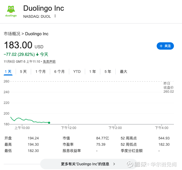 由于业绩指引不及预期,多邻国股价周四盘中大跌近30%。
