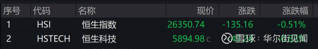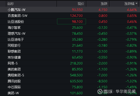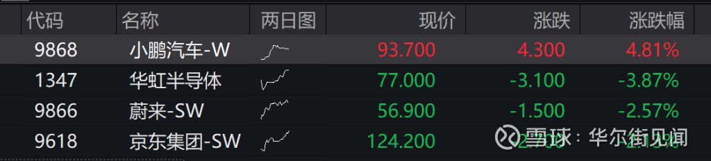 恒指低开0.51%,恒生科技指数跌0.83%。华虹半导体跌3.9%,蔚来、京东集团跌超2%。小鹏汽车涨4.8%。