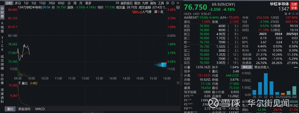 华虹半导体港股下跌4.1%,A股下跌4.8%.