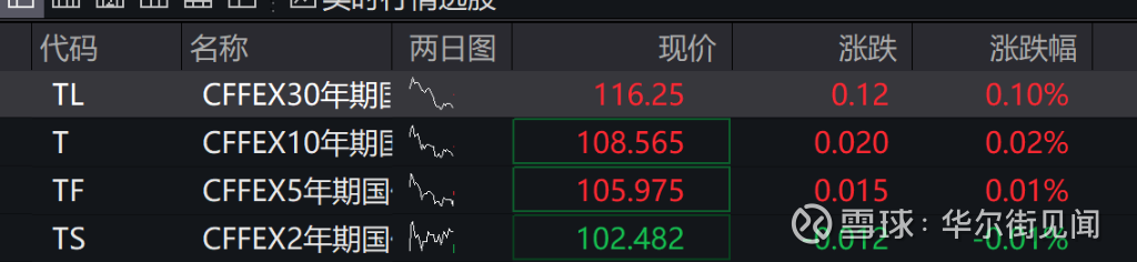 国债期货开盘,30年期主力合约涨0.10%,10年期主力合约涨0.03%,5年期主力合约涨0.05%,2年期主力合约涨0.01%。