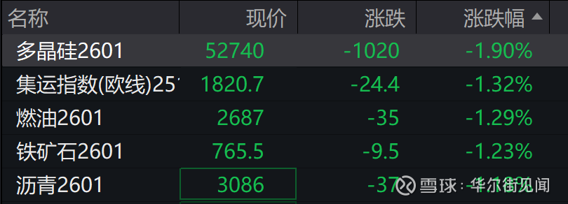 商品期货开盘,集运欧线主力合约跌超2%,多晶硅、燃料油、沥青、LU燃油、铁矿石跌超1%。尿素、乙二醇、菜籽油涨超1%。