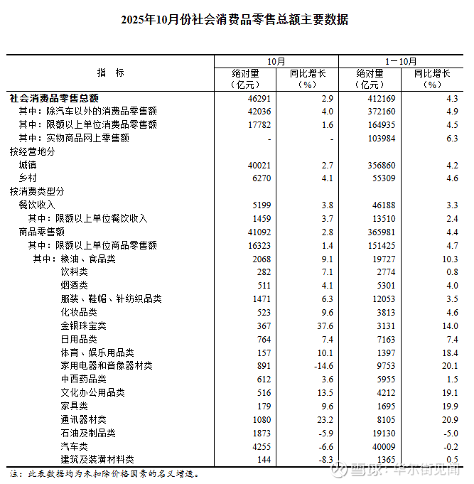 商品零售同比增2.8%,餐饮收入反弹至3.8%按经营单位所在地分,10月份,城镇消费品零售额40021亿元,同比增长2.7%;乡村消费品零售额6270亿元,增长4.1%。1—10月份,城镇消费品零售额356860亿元,增长4.2%;乡村消费品零售额55309亿元,增长4.6%。