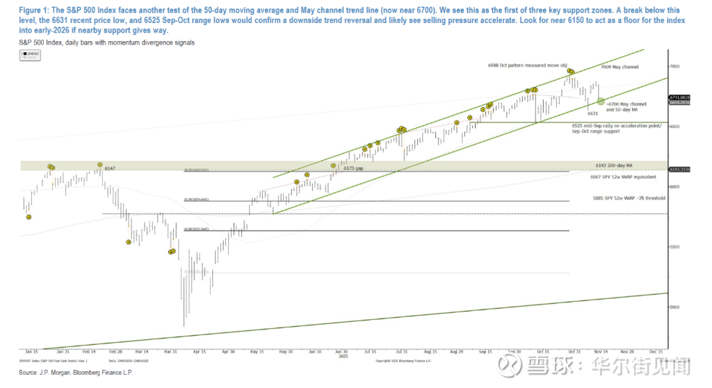 对美股的警告似乎正在成为华尔街的“共识”。据华尔街见闻文章,摩根大通表示,美股面临“关键防线”,标普500指数若相继跌破6700、6631及6525点三道防线,将确认进入下行趋势。而代表小盘股的罗素2000指数已呈现“最令人担忧”的破位形态。若关键支撑全面失守,市场调整或将持续至2026年初。