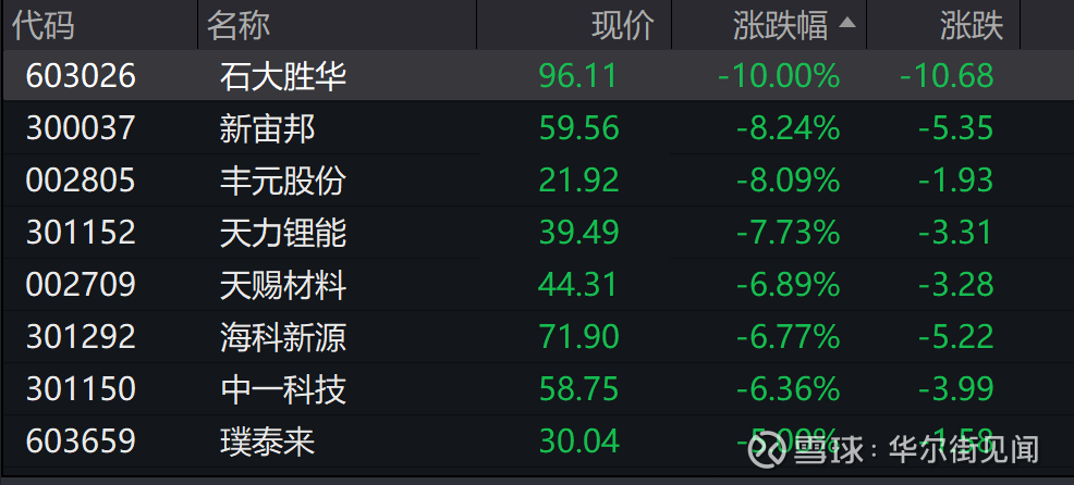A股电池板块跳水,石大胜华触及跌停,华盛锂电、壹石通、海科新源、天力锂能、新宙邦跟跌。