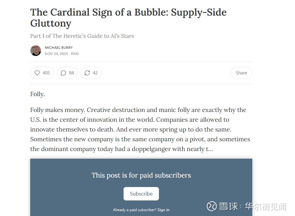 这一次,他并未如传言般通过巨额期权做空市场,而是选择通过首篇专栏文章《泡沫的主要迹象:供给侧的暴食》(The Cardinal Sign of a Bubble: Supply-Side Gluttony)来表达“做空AI”的观点。