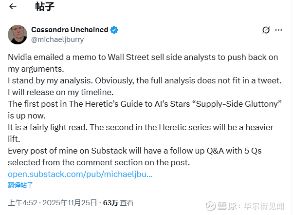 尾声:不受欢迎的预言家?需要指出的是,尽管Burry此前被媒体误报持有“近10亿美元”的英伟达空单(实际上其名义价值仅为920万美元,且已平仓部分),但这并未改变他看空AI宏观逻辑的决心。