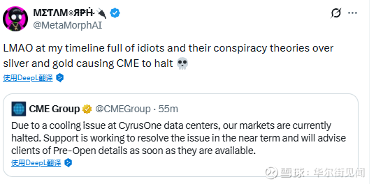 此次宕机事件的时间节点引发市场关注。网友Rheign Mac评论道:"就在白银触及历史新高时,CME关闭了!"社交媒体上迅速涌现各类讨论,部分投资者质疑这一技术故障的偶然性。