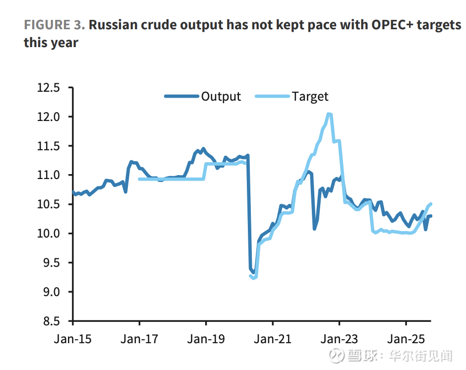 报告强调,当前市场对供应过剩的担忧被过度放大,而结构性利好因素却被低估。其分析依据主要来自两方面。一方面,是包括俄罗斯在内的OPEC+产油国普遍面临产能约束,实际产量持续低于目标水平。