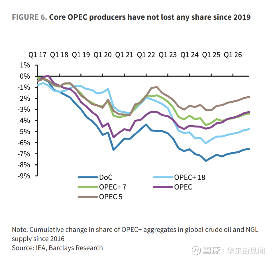 与此同时,全球原油供应弹性正在系统性下降。随着美国页岩油增长放缓及其他非OPEC地区资源衰减,全球有效闲置产能日益集中于沙特、阿联酋等极少数核心OPEC产油国。数据显示,自2019年以来,核心OPEC国家在全球原油及天然气液产量中的份额保持稳定,且预计明年还将进一步提升,这强化了其在全球供应格局中的定价能力。