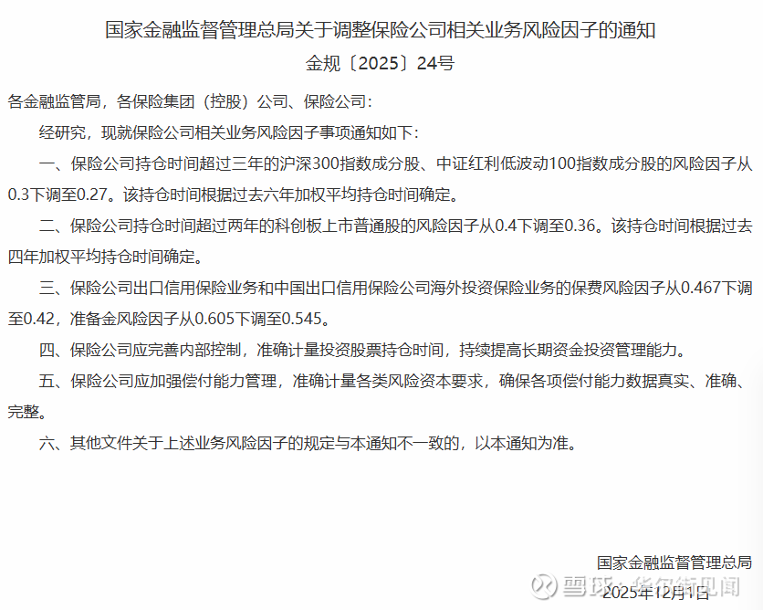 这一政策动态来自国家金融监督管理总局于2025年12月5日发布的《关于调整保险公司相关业务风险因子的通知》。根据通知,保险公司持有特定A股标的并满足一定持仓期限后,其在计算偿付能力充足率时适用的风险因子将获得下调。
