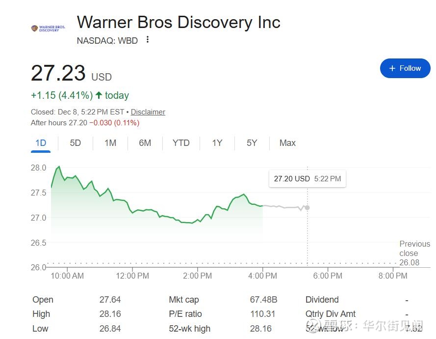 竞购战升级之际,12月8日周一,华纳兄弟和派拉蒙股价双双大涨,前者早盘刷新日高时涨近8%,后者早盘涨幅曾达到10.4%。而奈飞进一步下跌,早盘刷新日低时跌近5%。到收盘,华纳兄弟涨4.4%,派拉蒙涨约9%,奈飞跌约3.4%。