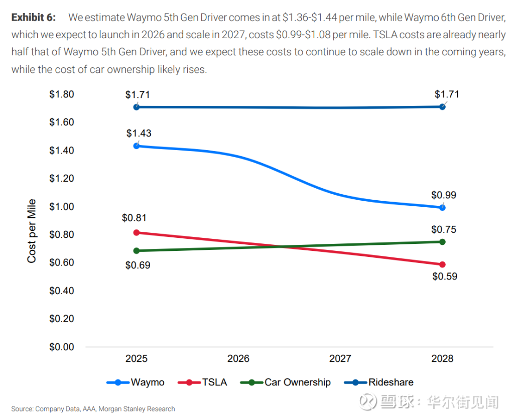Waymo: 目前第5代车型的每英里成本高达1.36-1.43美元。即使是预计2026年推出、2027年规模化的第6代车型,成本也仅降至0.99-1.08美元。
