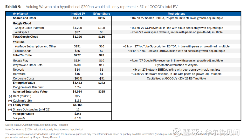 估值测算: 即使在假设情境下将Waymo估值提升至2000亿美元(相当于Uber全球网约车和外卖业务的总和),这也仅占Alphabet当前企业价值的约5%。