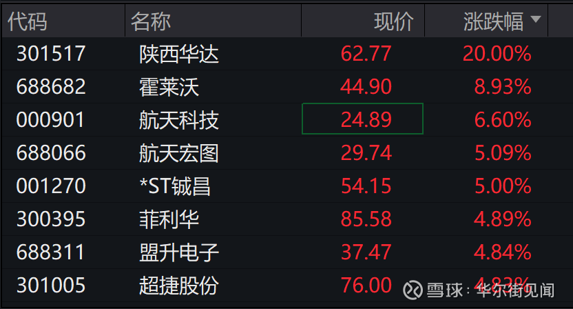 A股商业航天概念继续活跃,龙洲股份5连板,宝胜股份、西部材料3连板,陕西华达涨超10%,达华智能、航天宏图、雷科防务、顺灏股份跟涨。