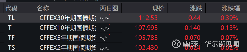 国债期货午盘全线上涨,30年期主力合约涨0.35%报112.480元,10年期主力合约涨0.12%报107.985元,5年期主力合约涨0.04%报105.755元,2年期主力合约涨0.01%报102.416元。