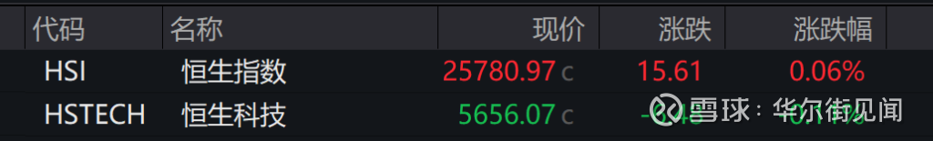 香港恒生指数开盘涨0.06%,报25780.97点;恒生科技指数跌0.11%。中芯国际、华虹半导体、快手等跌超1%。