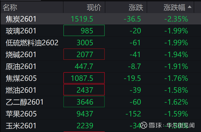 商品期货开盘,玻璃、焦炭主力合约跌超2%,烧碱、LU燃油、原油、焦煤、玉米、乙二醇、燃料油跌超1%。