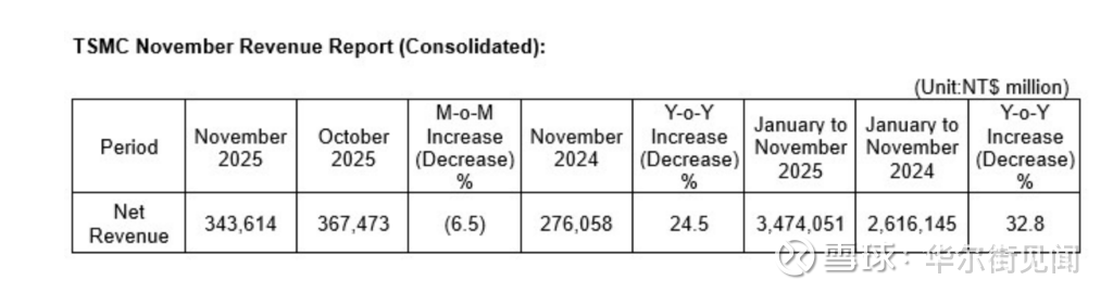 受人工智能相关需求继续推动,台积电11月营收环比下滑但同比保持强劲增长。