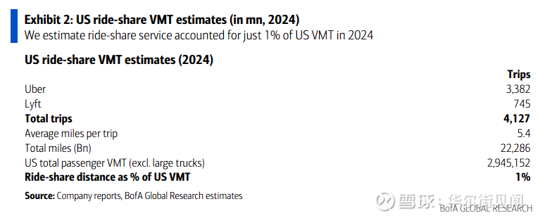 目前网约车服务对这一庞大市场的渗透极为有限。美银基于Uber 30%订单、Lyft 90%订单为美国本土业务,以及平均单次行程5.4英里的假设测算,2024年美国网约车行驶里程仅占全国总里程的1%。