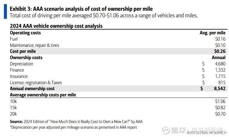 研报指出,自动驾驶技术被视为打破这一瓶颈的关键。美国汽车协会数据显示,私家车每英里综合持有成本为0.70-1.06美元,涵盖燃油、保养、保险、折旧等各项费用。而当前美国网约车每英里成本普遍在2.5-3.0美元,巨大的价格差距使多数消费者从经济角度选择保有私家车。
