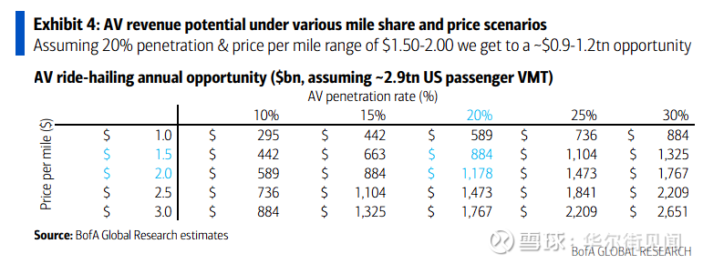 美银认为,若自动驾驶网约车能将每英里成本降至2.00美元以下,将成为推动其大规模普及的临界点。