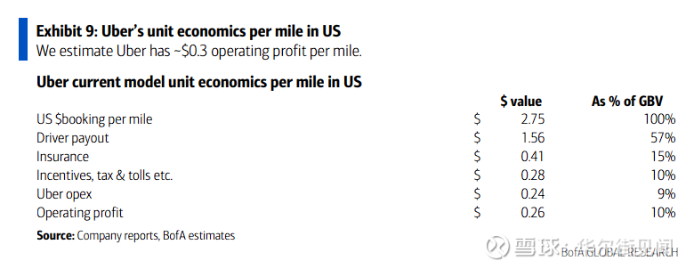 美银通过拆解成本结构,测算了Uber维持约10%利润率所需的每英里车费盈亏平衡点。