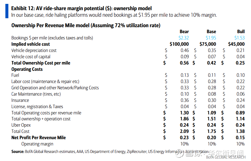 美银假设车辆使用率72%,对应年创收里程5.4万英里,车辆按4年折旧。基准情景下(车辆成本7.5万美元),每英里定价需达1.95美元才能维持10%利润率。