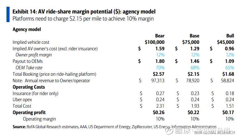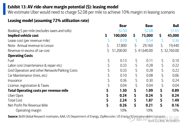 租赁模式:平台向整车厂商或金融机构租赁车辆,按每英里支付固定费用。基准情景下,美银估算每英里租赁费率为0.54美元,平台需将每英里定价设为2.08美元才能实现10%利润率。