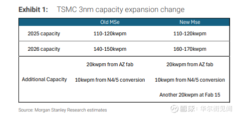 值得注意是,摩根士丹利最初预计台积电2026年的3纳米产能约为14万至15万片/月,但最新信息表明,这一数字可能被上调至16万至17万片/月。