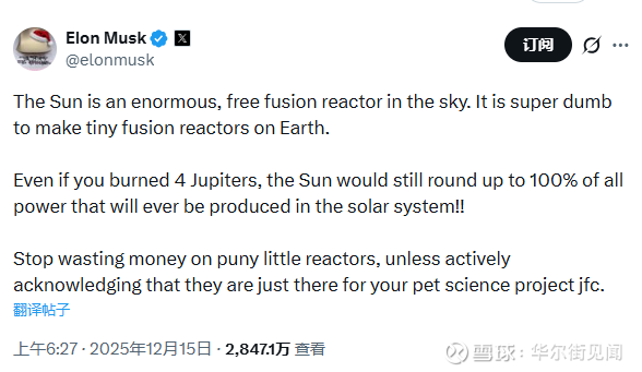 12月15日,马斯克在X平台的一篇帖子中,毫不掩饰他对地球核聚变项目的蔑视。他写道:“太阳是天空中一个巨大、免费的聚变反应堆。在地球上制造微型聚变反应堆是愚蠢至极的。”