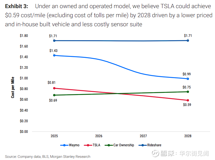 摩根士丹利分析显示,在自营模式下,特斯拉到2028年可实现每英里0.59美元的运营成本(不含过路费),显著低于Waymo的0.75美元、传统拼车服务的0.99美元,以及私家车使用成本的0.81美元。