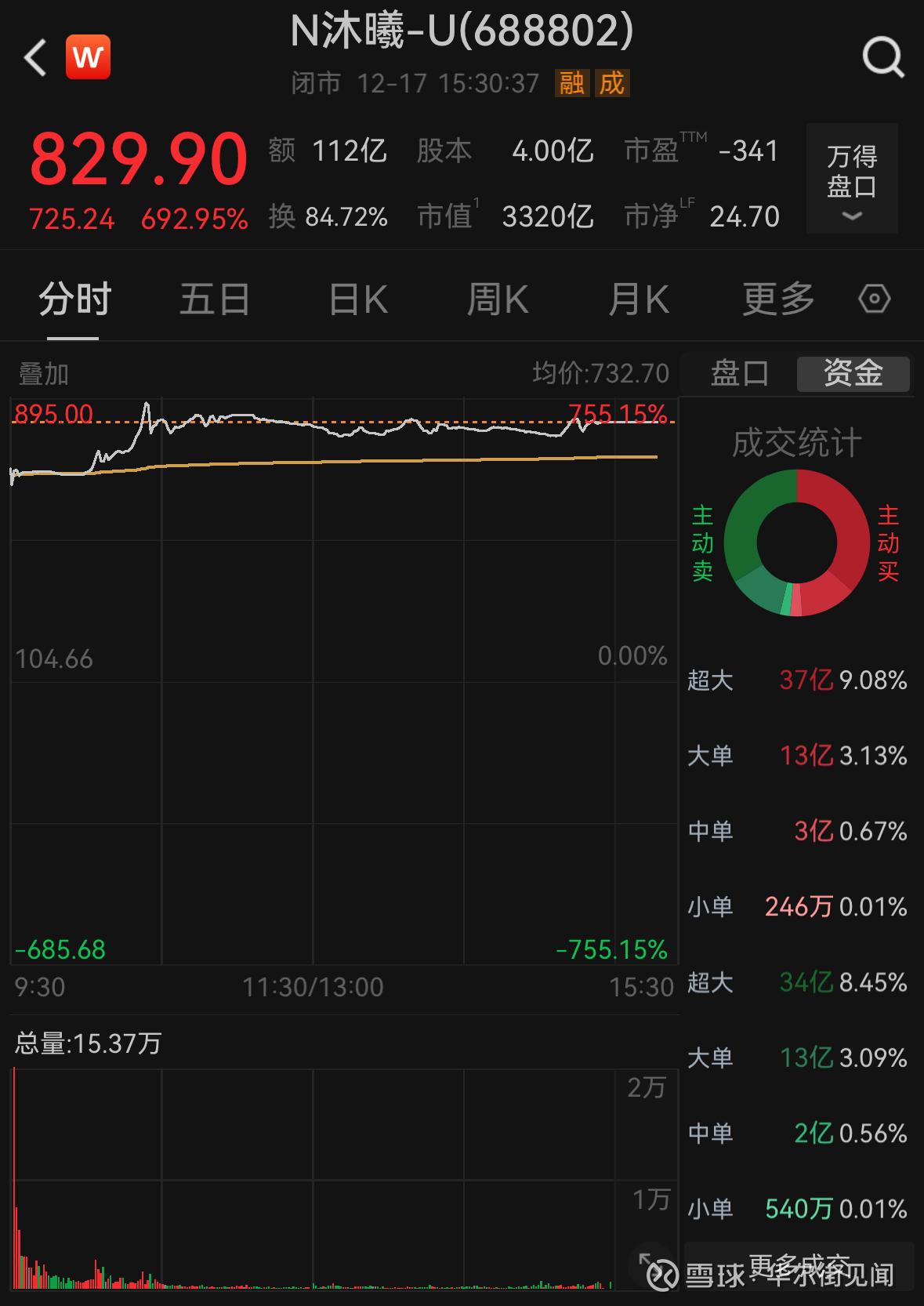 上市首日,沐曦股份股价一度暴涨超700%,盘中最高触及895元,单签浮盈接近40万元,刷新全面注册制以来的新股纪录,成为A股最赚钱新股。截止收盘,总市值3320亿元,逼近上周上市的摩尔线程(3360亿元)。