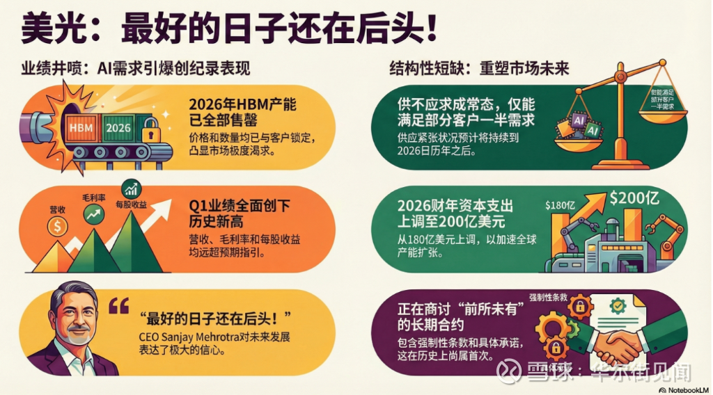 业绩与展望超预期:美光2026财年第一财季营收、毛利率和每股收益均远超指引上限,并发布了创纪录的第二财季业绩展望,为近期动荡的AI板块注入信心。 HBM产能售罄:美光宣布2026日历年的所有HBM(高带宽内存)产能已全部售罄,且价格和销量均已锁定。 HBM市场预期大幅上调:预计HBM市场规模到2028年将达到1000亿美元,这一里程碑比之前的预测提前了两年到来。 供需极度失衡:行业供应在可预见的未来将“远低于需求”,预计供应紧张状况将持续到2026年以后。CEO透露,中期内美光仅能满足部分关键客户50%至三分之二的需求。 前所未有的长期合约(LTA):正在与客户谈判一种全新的、带有强制性条款和具体承诺的多年期供货合同,这在历史上尚属首次。 资本开支上调:2026财年资本支出(CapEx)上调至200亿美元(此前预计180亿美元),主要用于支持HBM和先进工艺节点。 AI需求并未放缓:反驳了市场对AI泡沫破裂的担忧,指出AI数据中心建设正在推动内存和存储需求的急剧增加。 全线需求上调:公司上调了对服务器、PC等终端市场的增长预期,认为AI正从数据中心到边缘设备全面推动内存需求的结构性增长。