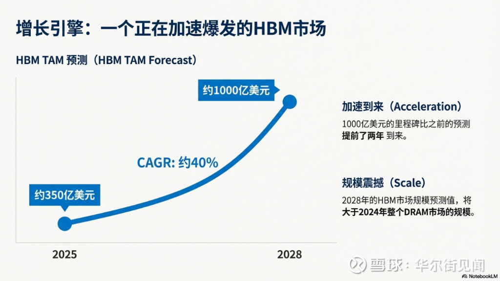 更具冲击力的是美光对HBM市场前景的惊人上调。公司预测,HBM的整体有效市场(TAM)将以约40%的年复合增长率,从2025年的约350亿美元增长到2028年的约1000亿美元。Mehrotra特别指出:“这一千亿美元的里程碑,现在预计比我们之前的展望提前了两年到来。”他补充说,这个数字甚至超过了2024年整个DRAM市场的规模。