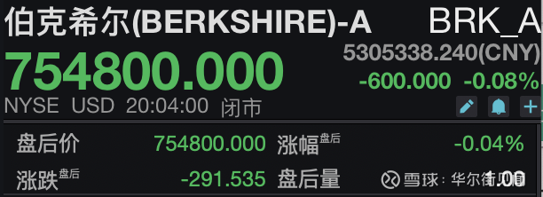 在巴菲特任内的最后一个交易日,伯克希尔A类股微跌0.1%,收于754,800美元;B类股下跌0.2%,收于502.65美元,为这一非凡时代画上了平静的句点。