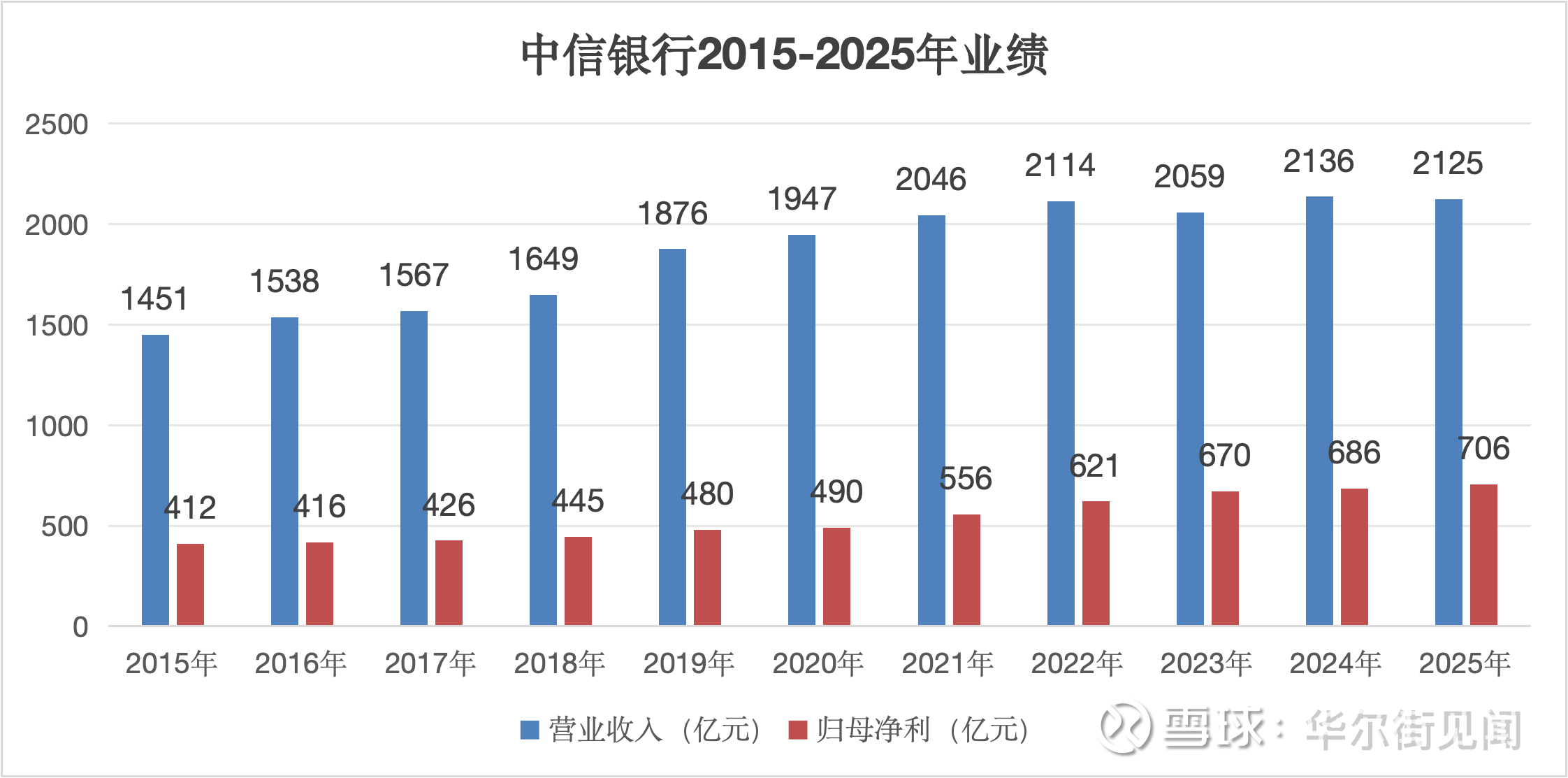 在资产规模顺利突破10万亿元大关的里程碑时刻,中信银行2025年实现营业总收入2124.75亿元、同比微降0.55%,归母净利706.18亿元、同比增长2.98%。