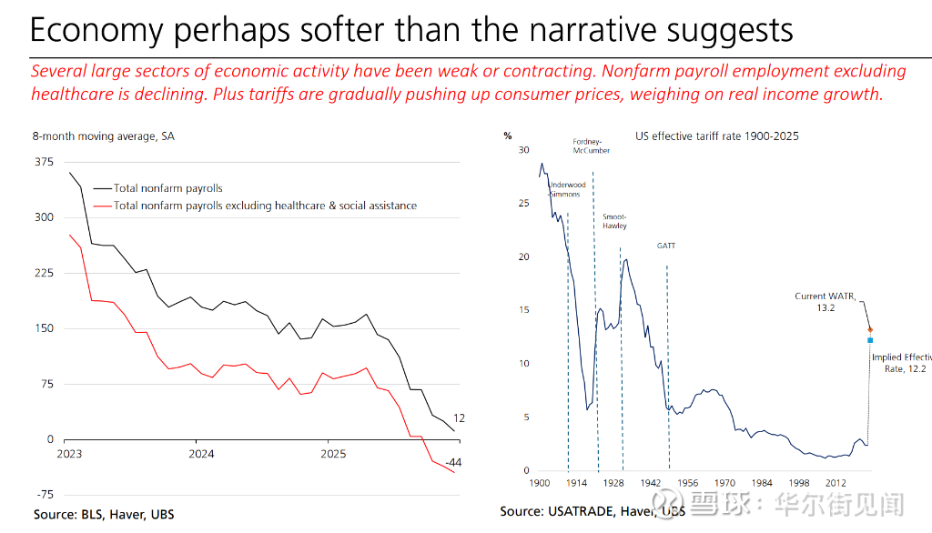 据追风交易台,瑞银在1月23日的报告中指出,尽管总体经济数据看似强劲,但增长来源极其狭窄。除AI和科技板块外,大部分实体经济处于疲软甚至收缩状态。劳动力市场的扩张已经显著放缓,除去医疗保健行业的“繁荣”,就业实际上是在萎缩。