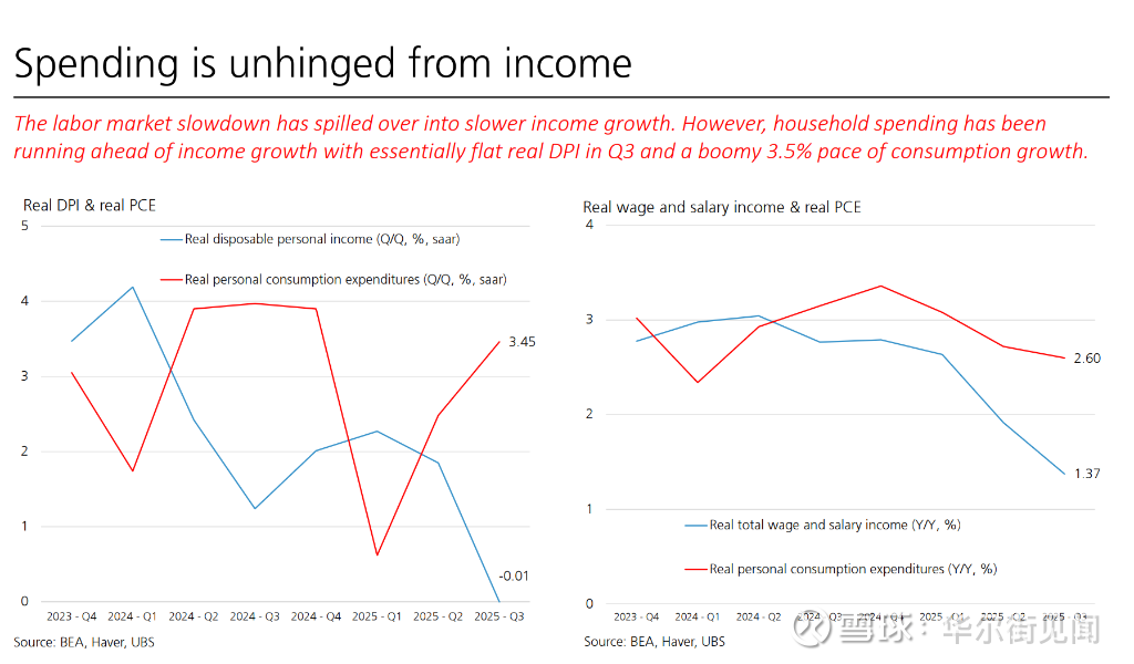 消费端同样呈现剧烈的K型分化。二季度股市财富占家庭总财富的比例达到了创纪录的37%,且过去几年的财富增长几乎全部来自股市。这导致高收入群体的消费由科技股牛市支撑,而其余群体的消费能力正被通胀和实际收入停滞所侵蚀。简而言之,这是一场由AI和科技主题驱动的“富人狂欢”,而广泛的实体经济已经处于衰退边缘。