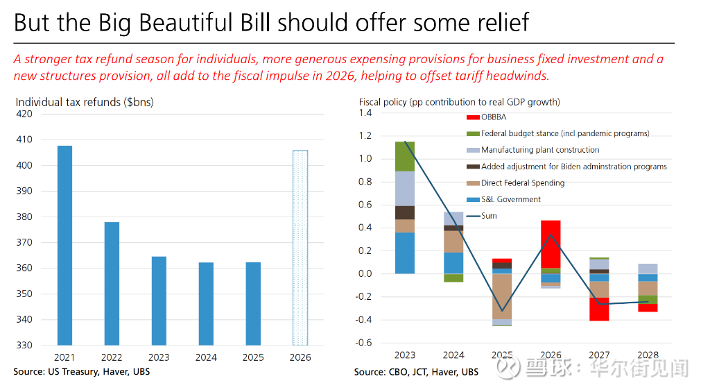 财政救命稻草:"One Big Beautiful Bill"带来的退税潮在私人部门需求疲软的背景下,财政政策再次成为短期救生圈。瑞银预计,随着大美丽法案("One Big Beautiful Bill Act"(OBBBA))法案的实施,2026年第二季度将迎来巨大的个人退税潮,预计退税规模将增加约500亿至600亿美元。