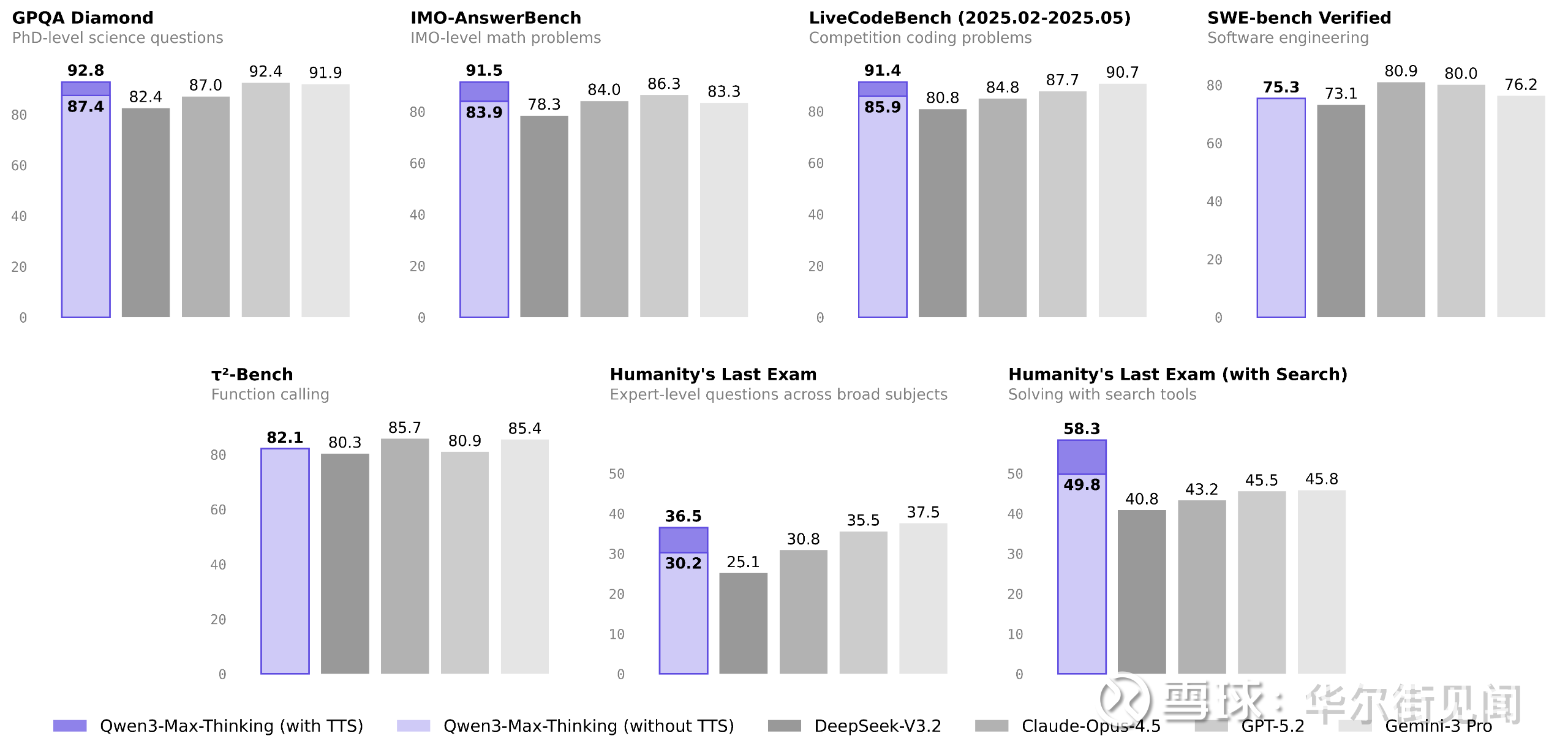 该模型采用全新的测试时扩展机制,实现推理性能大幅提升的同时更具经济性。在启用工具的HLE(Humanity's Last Exam)评测中,千问得分58.3,大幅超过GPT-5.2-Thinking的45.5